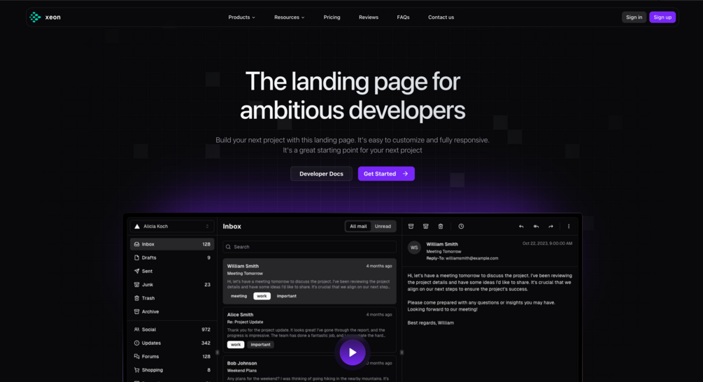 Xeon is a landing page template designed for SaaS, startups, and product showcases. It features a clean and modern design with sections for product features, testimonials, pricing, and more. The template is fully responsive and customizable, making it easy to adapt to your brand's needs.